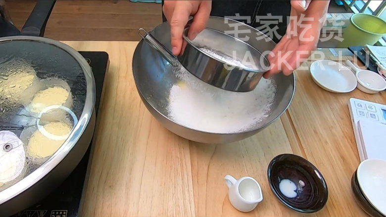 11. 全程小火,隔水蒸20分钟左右。或者烤箱140℃,用水浴法烤30分钟。