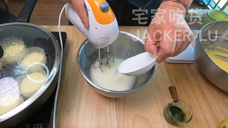 18. 细砂糖在粗泡、中泡、细泡的时候,分别加入,最开始高速打发,后面全程低速打发,可以使泡沫更细腻。