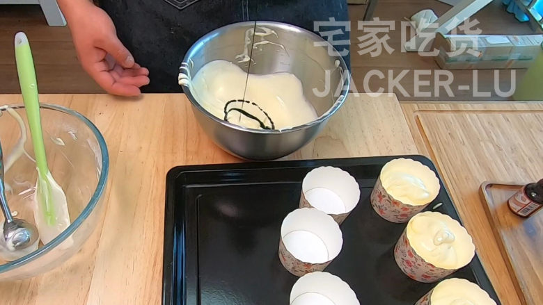 24. 再取另一半的面糊,加入前面准备好的抹茶液。