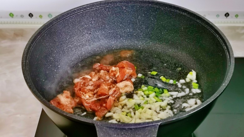 9. 起油锅,加入葱蒜辣椒煸炒出香味,加入腌制好的肉片,翻炒至8分数。