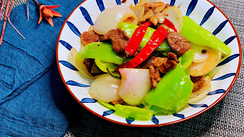 7. 倒入洋葱、青椒和尖椒
