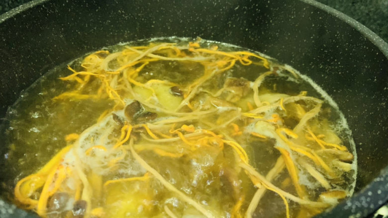 13. 倒入虫草花,连浸泡的水也一起倒入