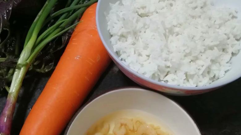 虾米炒饭,<a style='color:red;display:inline-block;' href='/shicai/ 3374'>紫苏</a>取叶子,切碎,<a style='color:red;display:inline-block;' href='/shicai/ 25'>胡萝卜</a>切丁,<a style='color:red;display:inline-block;' href='/shicai/ 37'>姜</a>切末,<a style='color:red;display:inline-block;' href='/shicai/ 3250'>葱</a>切<a style='color:red;display:inline-block;' href='/shicai/ 3250'>葱</a>花