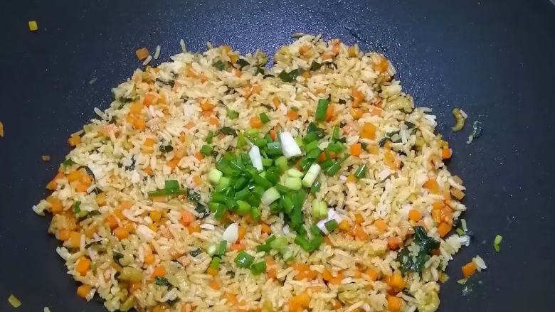 9. 炒至颜色均匀后加入葱花,再次炒匀便可