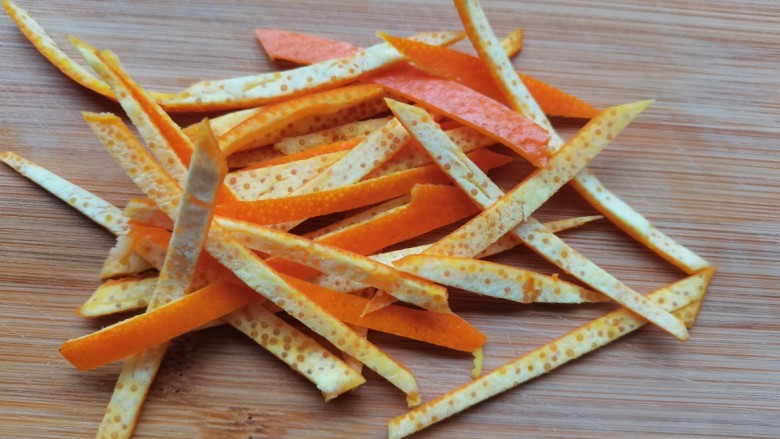 9. 橙子皮洗净刮掉表面白的部分,切成丝