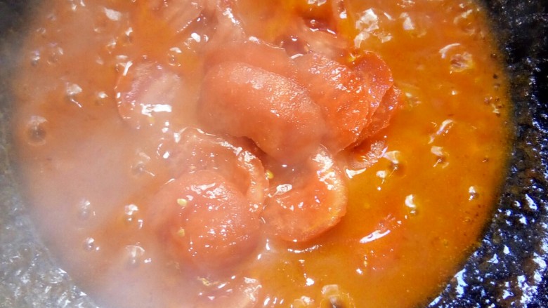 7. 汤锅加水倒入番茄汁大火煮沸。
