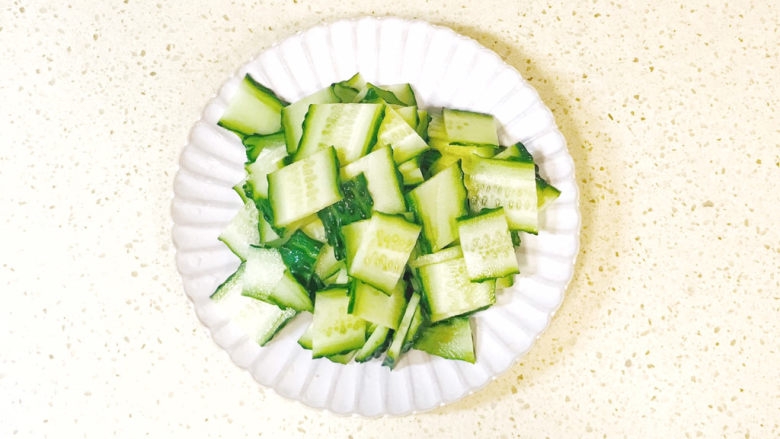 7. 黄瓜洗净,同样先切成段,再切薄片
