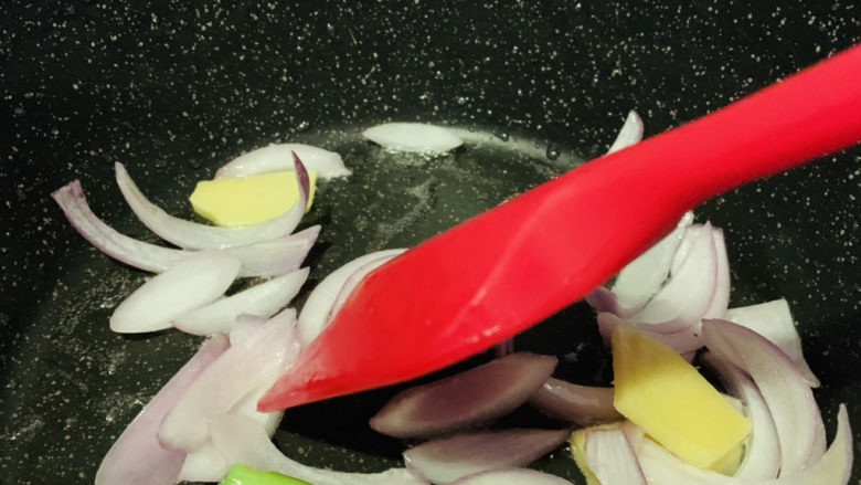 8. 热锅,加1勺食用油,加入备好的洋葱、姜片等