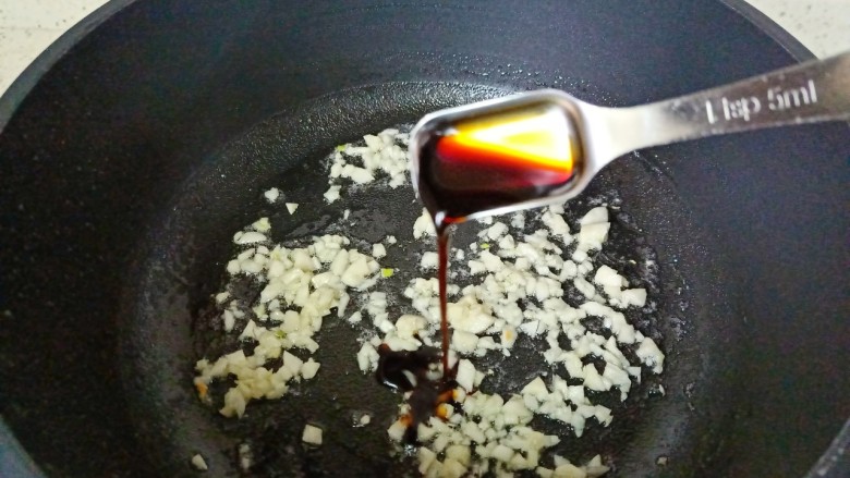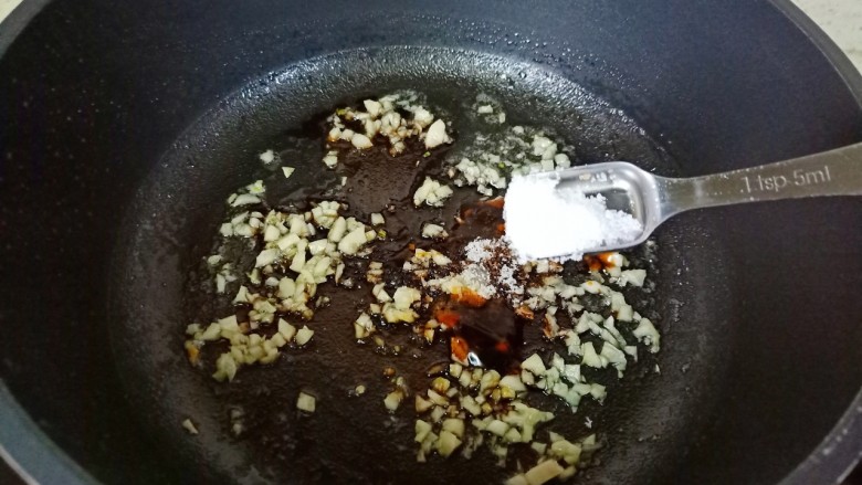 4. 锅里留适量的底油,放入蒜泥炒香。
