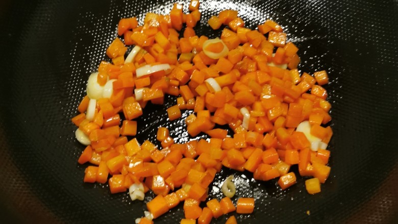 7. 起油锅放入食用油,油热后放入胡萝卜丁翻炒。