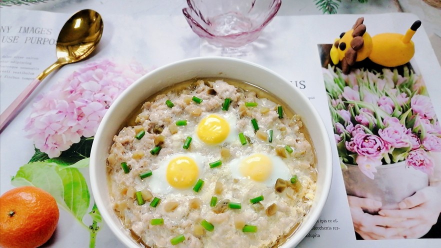 15. 拍上成品图,一道美味又营养的榨菜蒸肉饼就完成了。
