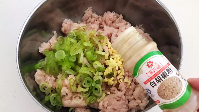 5. 把葱姜末放入鱼肉里,加入白胡椒粉
