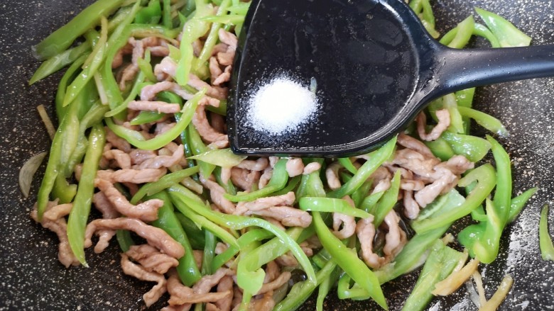 9. 下入青椒丝。