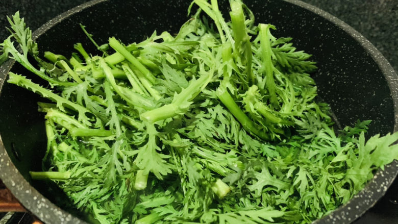 茼蒿鱼丸汤,把茼蒿放入焯水
