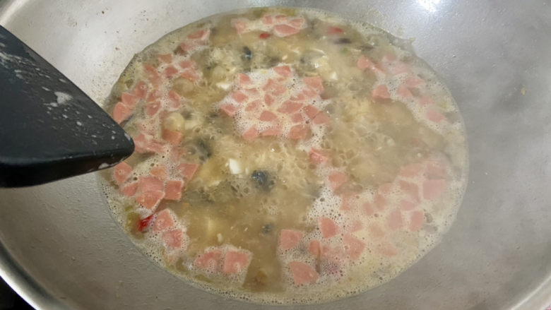 14. 下火腿肠皮蛋咸鸭蛋,中小火翻炒一分钟
