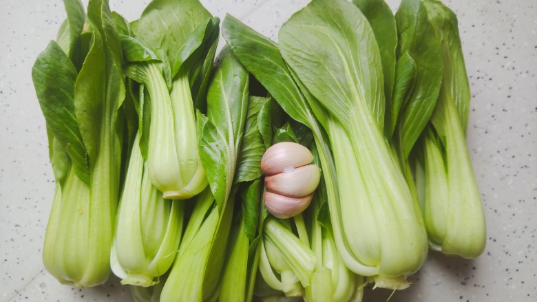 7. 压好之后的蒜泥和洗好的油菜放在一起