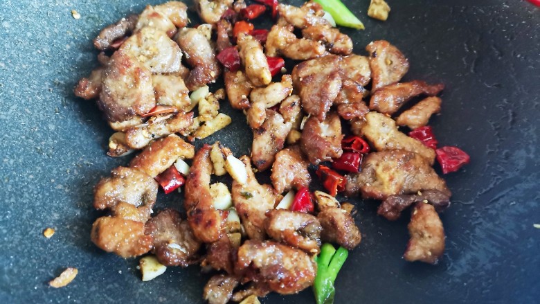 13. 下入炸好的肉片翻炒几下