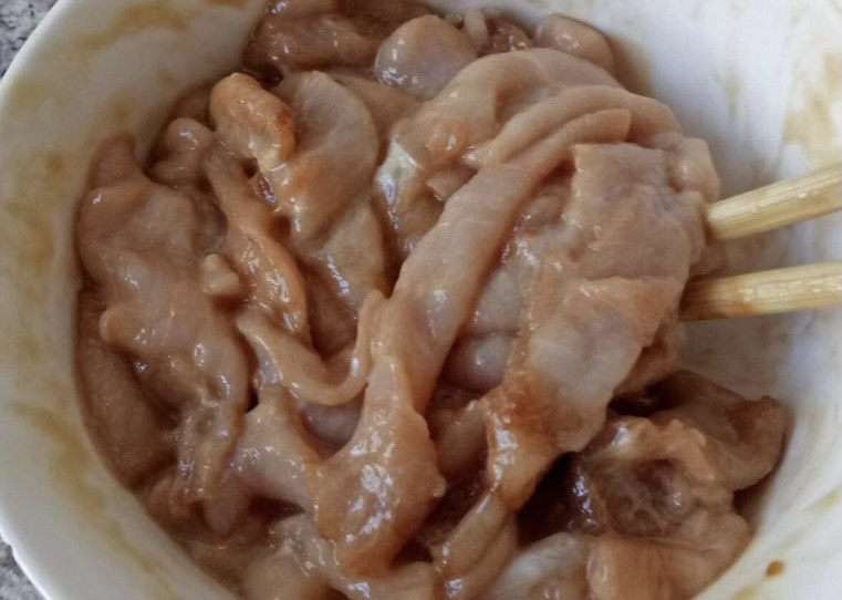 12. 将肉用料酒、蚝油、盐、糖腌渍一会儿。