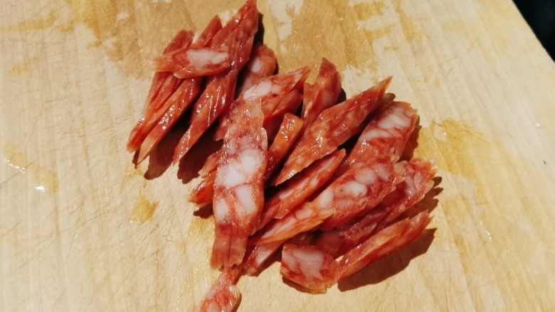 6. 起油锅放入食用油,油热后放入腊肠翻炒。
