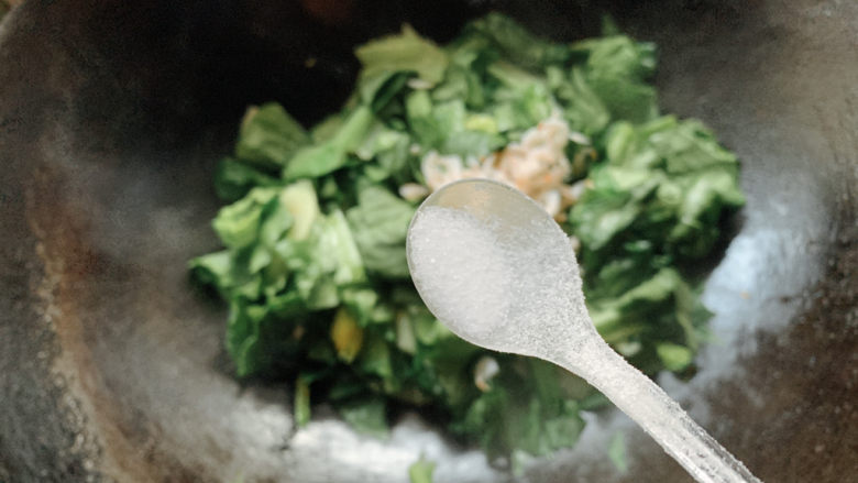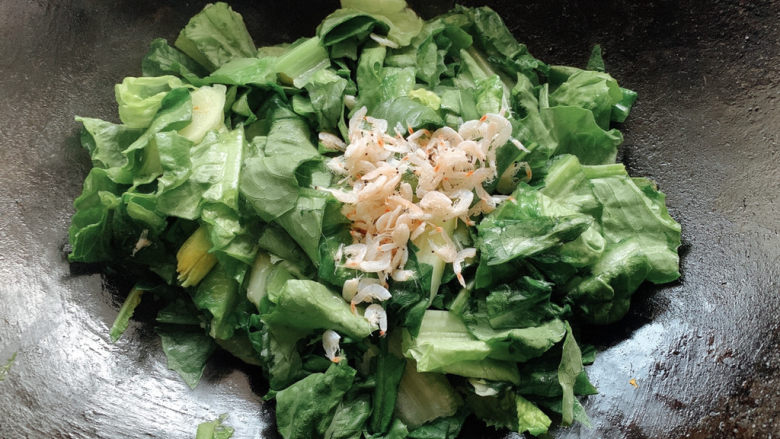 7. 翻炒变软后,加少许清水,加虾米增加鲜味