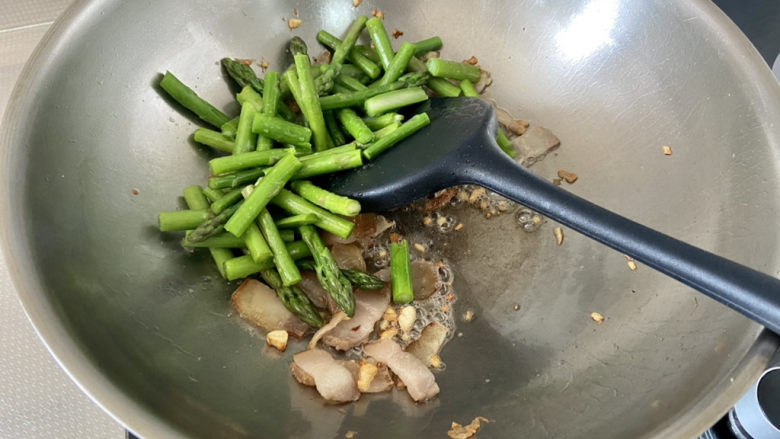 12. 倒入芦笋焯烫半分钟
