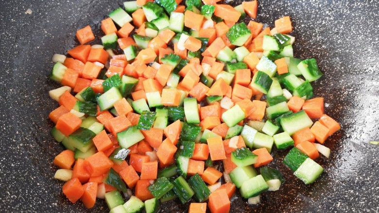 10. 下入胡萝卜丁翻炒一分钟左右。
