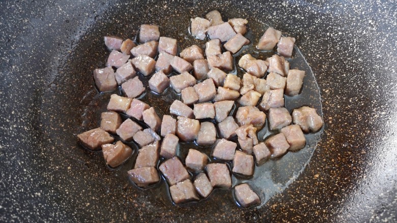 7. 炒锅内倒适量的食用油烧热,下入牛排丁。
