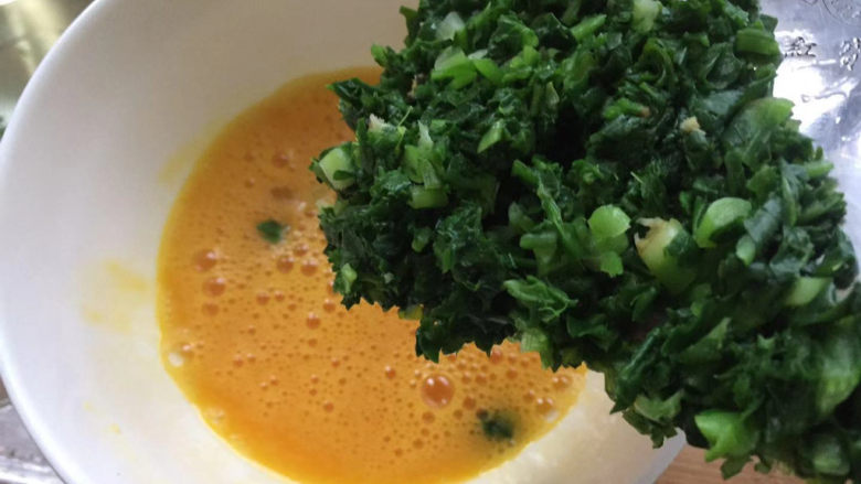 14. 倒入荠菜鸡蛋液,中小火稍微煎一会