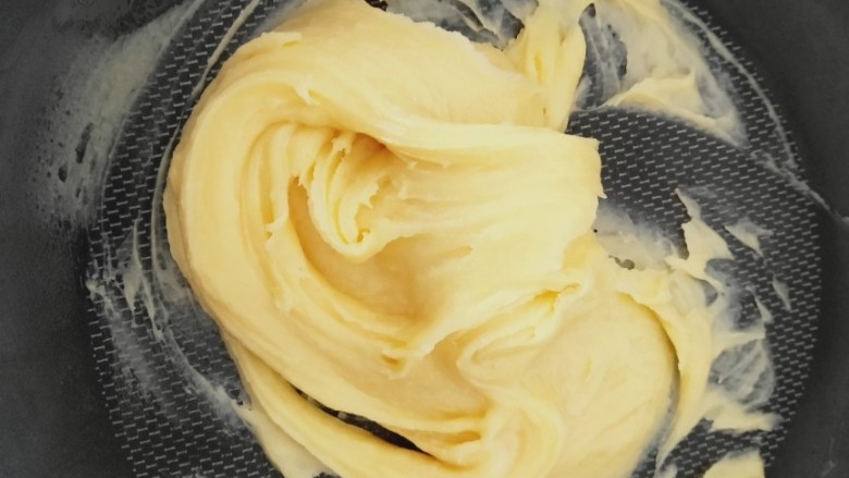 7. 等面糊冷却到65~60度的时候,再慢慢加入蛋液搅拌均匀的,使面糊与蛋液充分混合,切记蛋液不能一次性加入噢