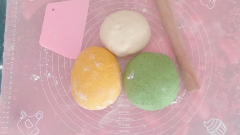 1. 这是提前和好的面团:黄色是用南瓜做的,绿色是菠菜做的,白色是原味,醒发好拿出来揉搓排气