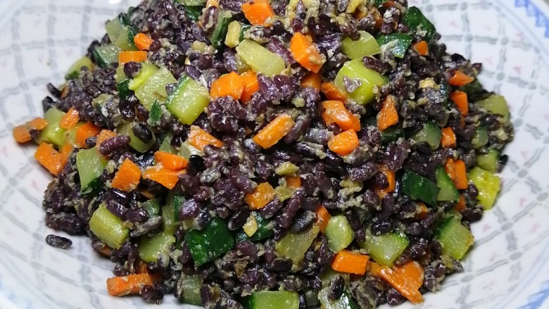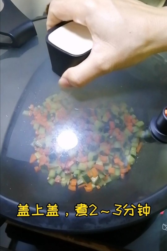 7. 香加入青瓜丁和胡萝卜丁,翻炒片刻