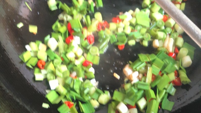 7. 加入蒜叶翻炒,中火炒四分钟。加入适量盐。