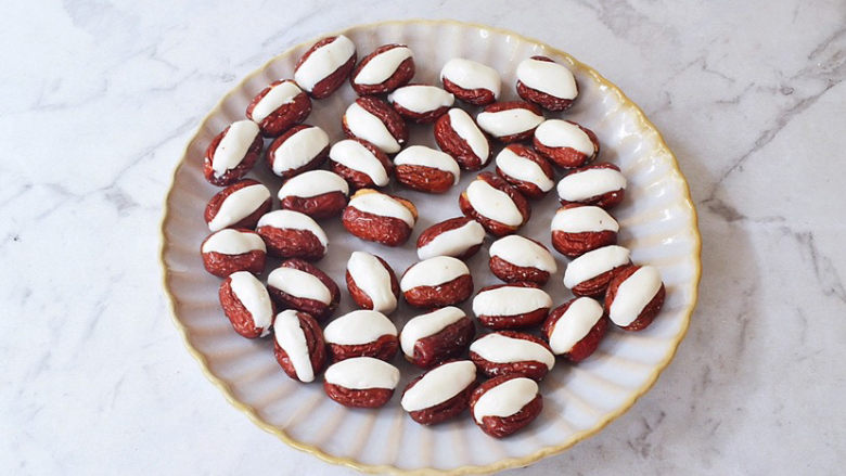 12. 将做好的糯米红枣摆放在盘中,开口朝上