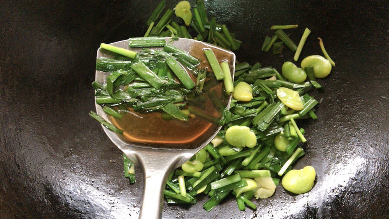 5. 锅烧热油,用韭菜根先行煸炒出香味。