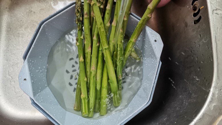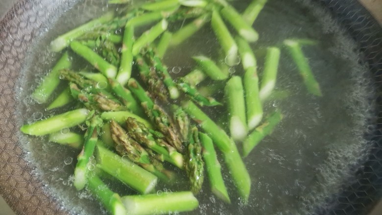 5. 锅里烧水,加入适量油和盐,水开下入芦笋焯水至断生捞出控干水分备用