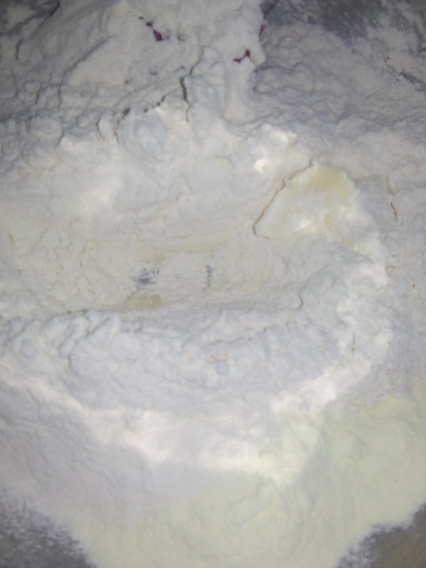 7. 黄油室温解冻后,加糖粉用打蛋器打融,筛入低筋粉,加入奶粉。