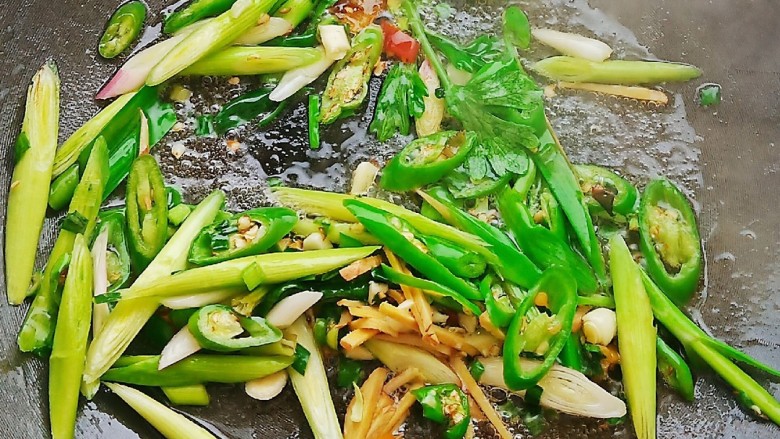 15. 加入芹菜和蒜叶炒至断生,装盘撒上香菜即可。
