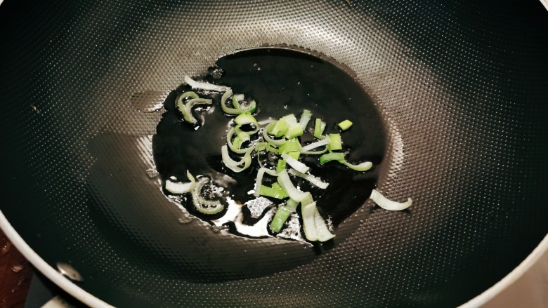 5. 起油锅放入食用油,油热后放入葱炒香。