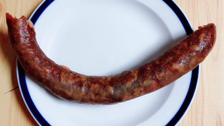 6. 锅中倒入油,加热至五成热,放入腊肠翻炒均匀。