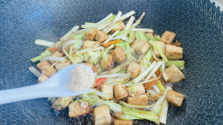 11. 烹入一勺生抽,加入少许热水翻炒断生即可