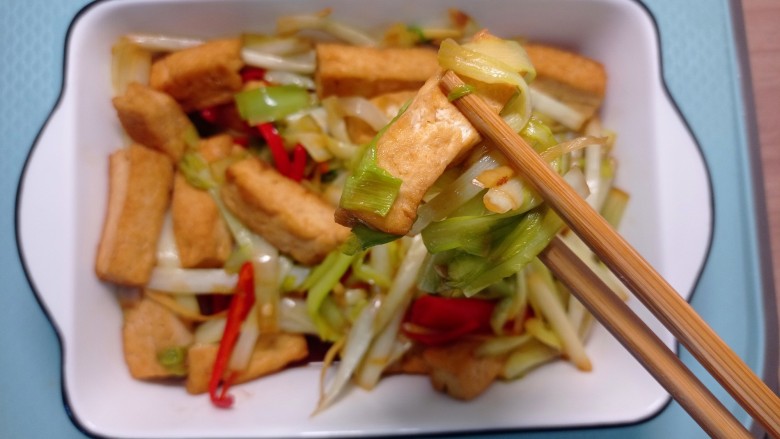 11. 锅内留少许色拉油,倒入辣椒丝,生姜丝爆香