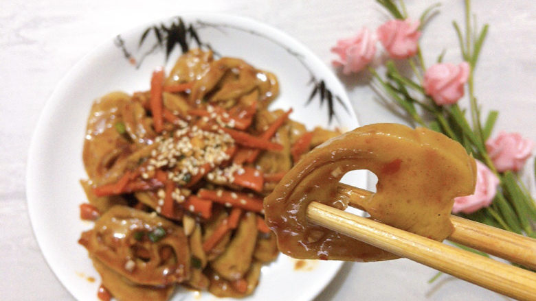 2. 将面筋斜切成片、胡萝卜切丝待用。