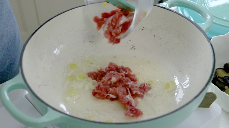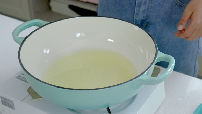 8. 倒入足够的油,中小火加热(珐琅锅不能空烧,所以倒油后再开火加热)