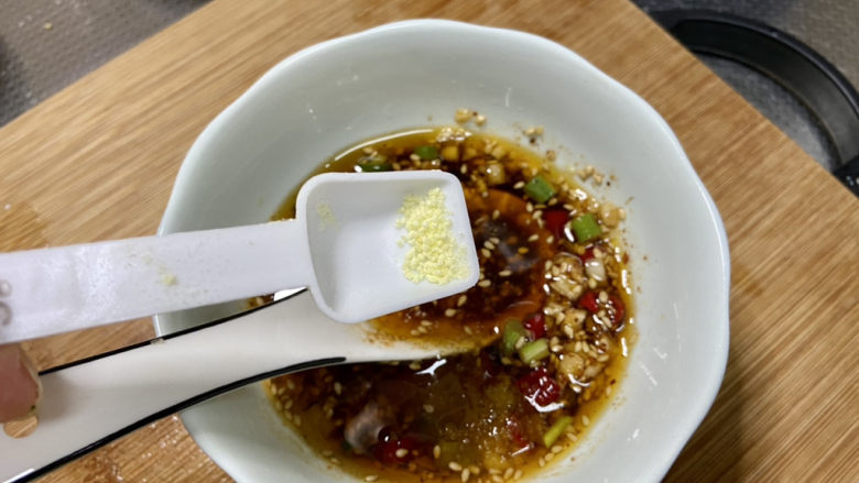 21. 来准备调味汁:取一个耐热的碗,加入小米辣葱白蒜末