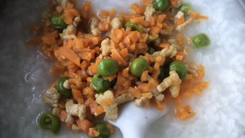 14. 熬煮至米烂时下入炒好的胡萝卜肉末。