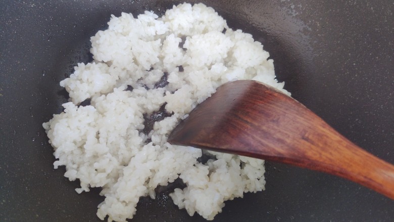 8. 一边翻炒,一边用锅铲将米饭捣散