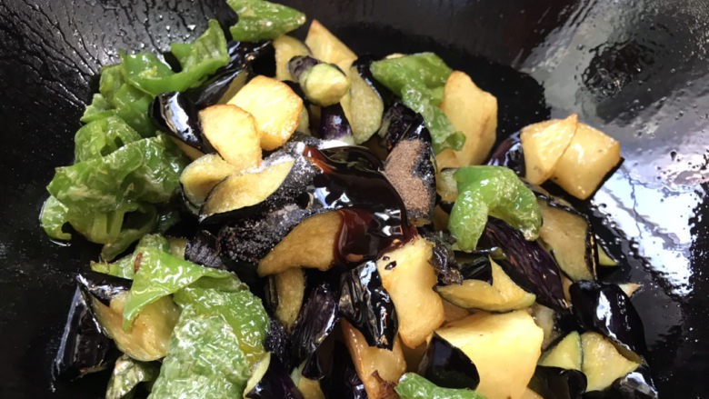 10. 青椒下锅炸至表面变色,捞出放在土豆上