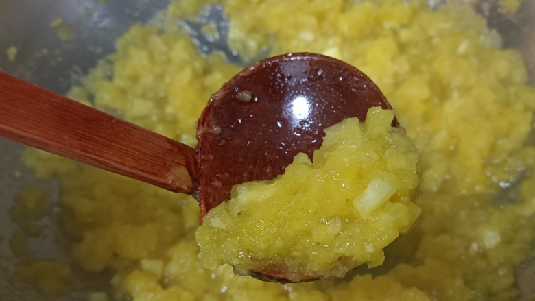 14. 最后锅内基本看不到什么水分了,舀一勺也没有水分低落,比较聚团就好了。但也别煮太干,太干就成菠萝馅了。