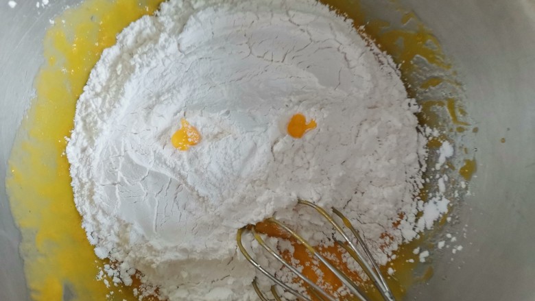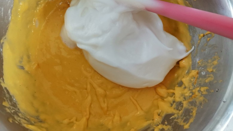11. 取三分之一蛋白霜到蛋黄糊里翻拌均匀