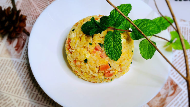 11. 锅加食用油,加入米饭,加入火腿粒,翻炒一会